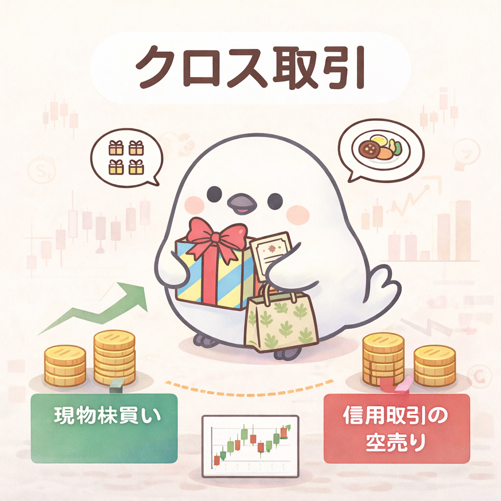 クロス取引とは、現物買いと信用売りを同時に行うことで株価変動の影響を相殺し、株主優待だけを取得する方法です。